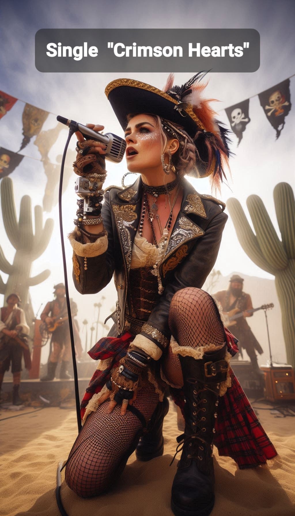 灼けた砂漠を突き進む“深紅の心臓”をテーマにした、AIオリジナル楽曲「Crimson Hearts」。190BPMで駆け抜けるケルティック・オーケストラル・パンクロックが、力強い女性ボーカルと重厚なストリングスを乗せて、壮大でエモーショナルな世界を描き出します。